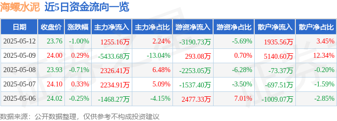 本站消息,截至2025年5月12日收盘,海螺水泥(600585)报收于23.76元,下跌1.0%,换手率0.59%,成交量23.59万手,成交额5.61亿元。